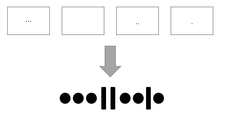 예를 들어서, n = 4, k = 6 이라면 상자 4개에 똑같은 물건 6개를 집어넣는 것이고, 물건을 점, 상자 사이를 구분선으로 구분하면 그림과 같이 표현할 수 있다.